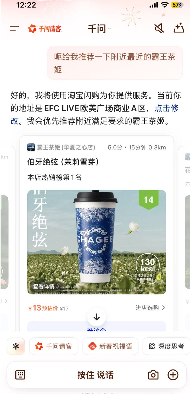 Qwen AI in commerce > On January 15, 2026, Qwen integrated with Taobao Flash Sale and Alipay AI Pay, launching a natural language ordering feature (consumers can directly voice “给我点一杯奶茶” to get delivery). Chinese consumers placed over 120 million orders through Alibaba‘s Qwen app in six days. Plus, Qwen has now integrated with Amap and other Alibaba services, positioning itself as a new consumer search gateway—challenging not only e-commerce platforms but also search engines.