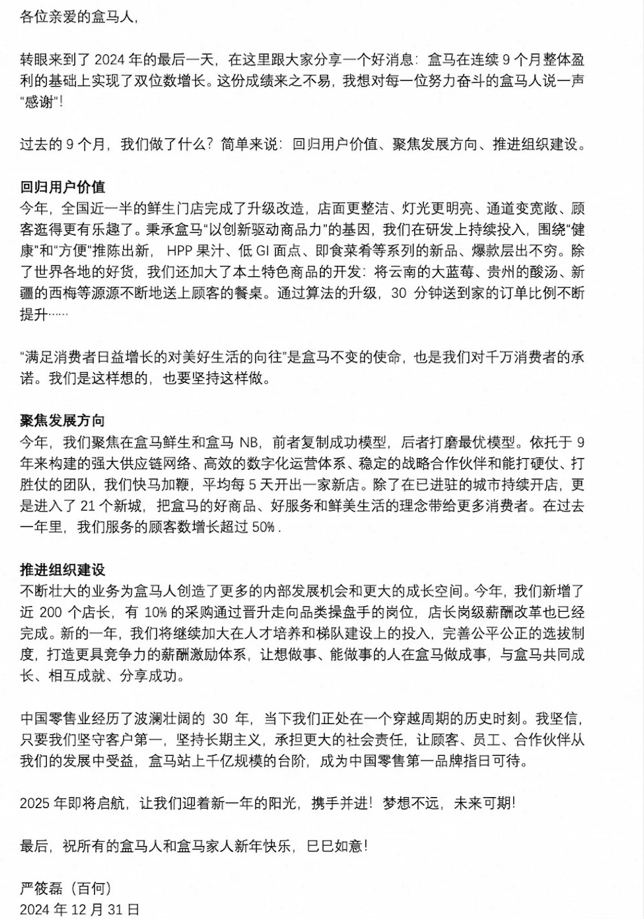 Freshippo, Alibaba Group's grocery chain subsidiary, achieved nine consecutive months of profitability, announced the CEO on the final day of 2024