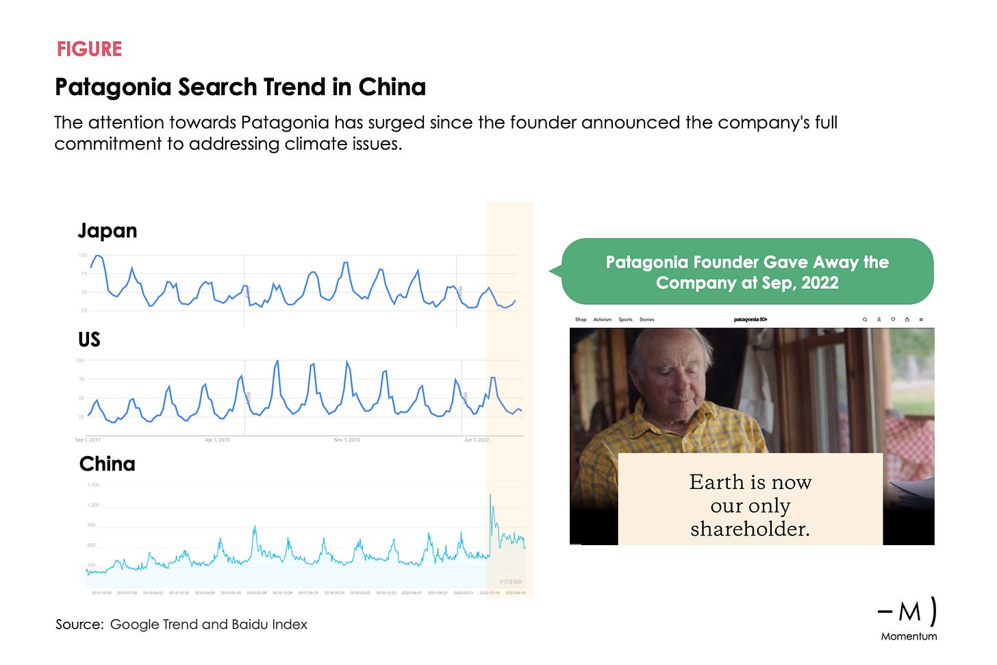 The early entry enabled Patagonia to gather a certain number of fans, but it didn't gain popularity in China until 2022 when the founder generously gave away the whole company to fight against climate change.